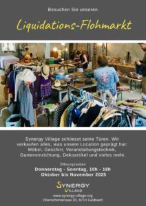 Synergy Village schliesst seine Türen. Nach vielen Jahren voller Begegnungen und Kultur wird beim grossen Liquidations-Flohmarkt alles, was den Ort geprägt hat, verkauft: Möbel, Geschirr, Veranstaltungstechnik, Garteneinrichtung, Dekoartikel und vieles mehr. Der Flohmarkt findet von Oktober bis November jeweils Donnerstag bis Sonntag, 10 bis 18 Uhr, statt.